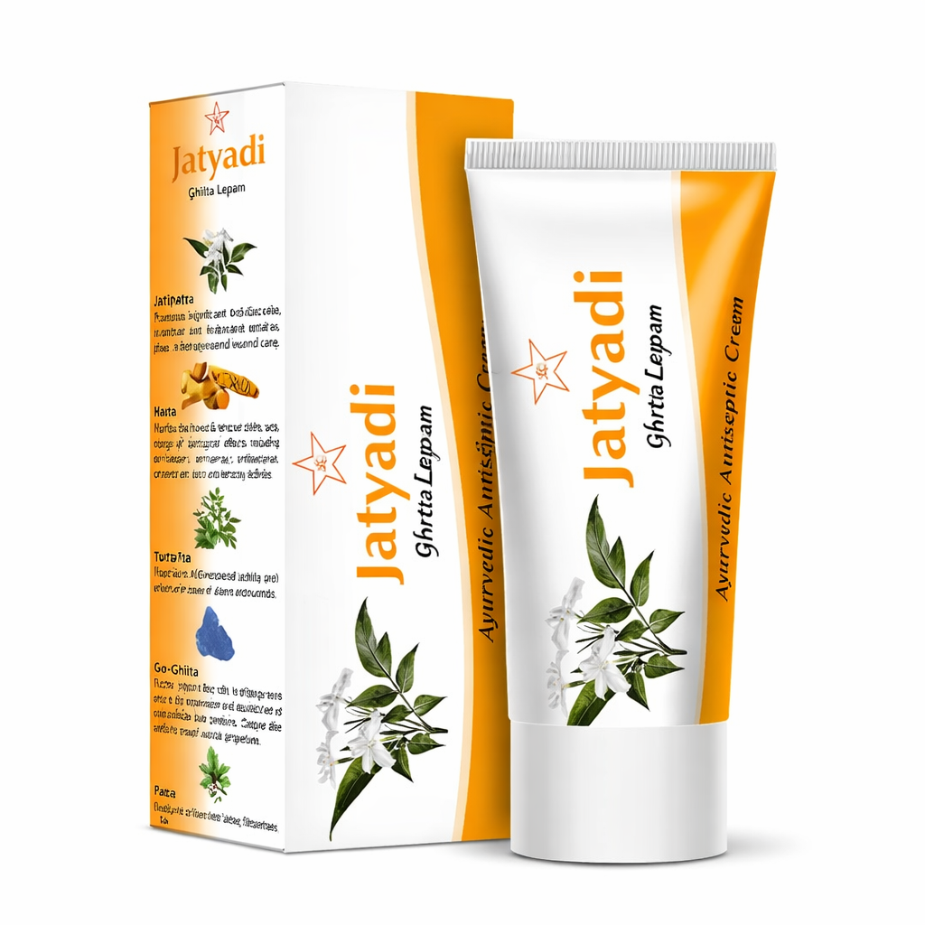 SKM Jatyadi Ghrta Lepam is a classical Ayurvedic topical preparation formulated with medicated ghee and traditional herbal ingredients. The formulation is inspired by the traditional Jatyadi Ghrita preparation described in Ayurvedic texts and commonly used for external skin care applications.The herbal ingredients are processed in Go-Ghrita (clarified butter) which helps nourish the skin and supports better absorption of herbal components. The formulation helps maintain skin hygiene, soothe irritated areas, and support the skin’s natural recovery process.In Ayurvedic practice, Jatyadi preparations are commonly applied externally for maintaining healthy skin tissue and supporting comfort in damaged or sensitive skin areas.