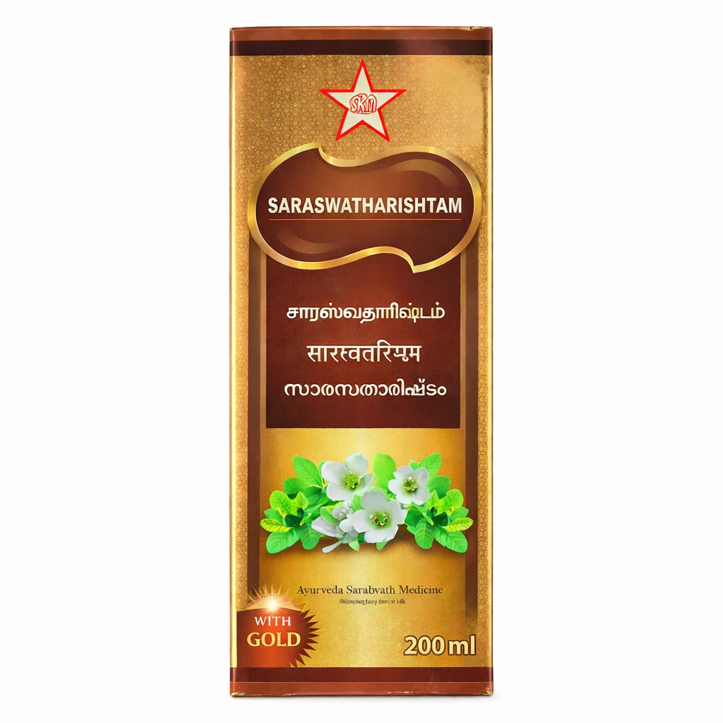 SKM Saraswatharishtam with Gold is a classical Ayurvedic Arishtam formulation prepared through natural fermentation of selected herbs. This traditional tonic is formulated with well-known Medhya (brain-supportive) herbs such as Brahmi, Ashwagandha, and Shatavari, combined with Swarna (Gold) for enhanced rejuvenative value.The formulation is traditionally used to support cognitive functions such as memory, concentration, and mental clarity. The herbal blend may also help maintain emotional balance and support the nervous system during periods of stress, mental exertion, or fatigue. Due to the presence of adaptogenic herbs, it may assist the body in coping with mental strain and help maintain overall neurological wellness when used as directed.